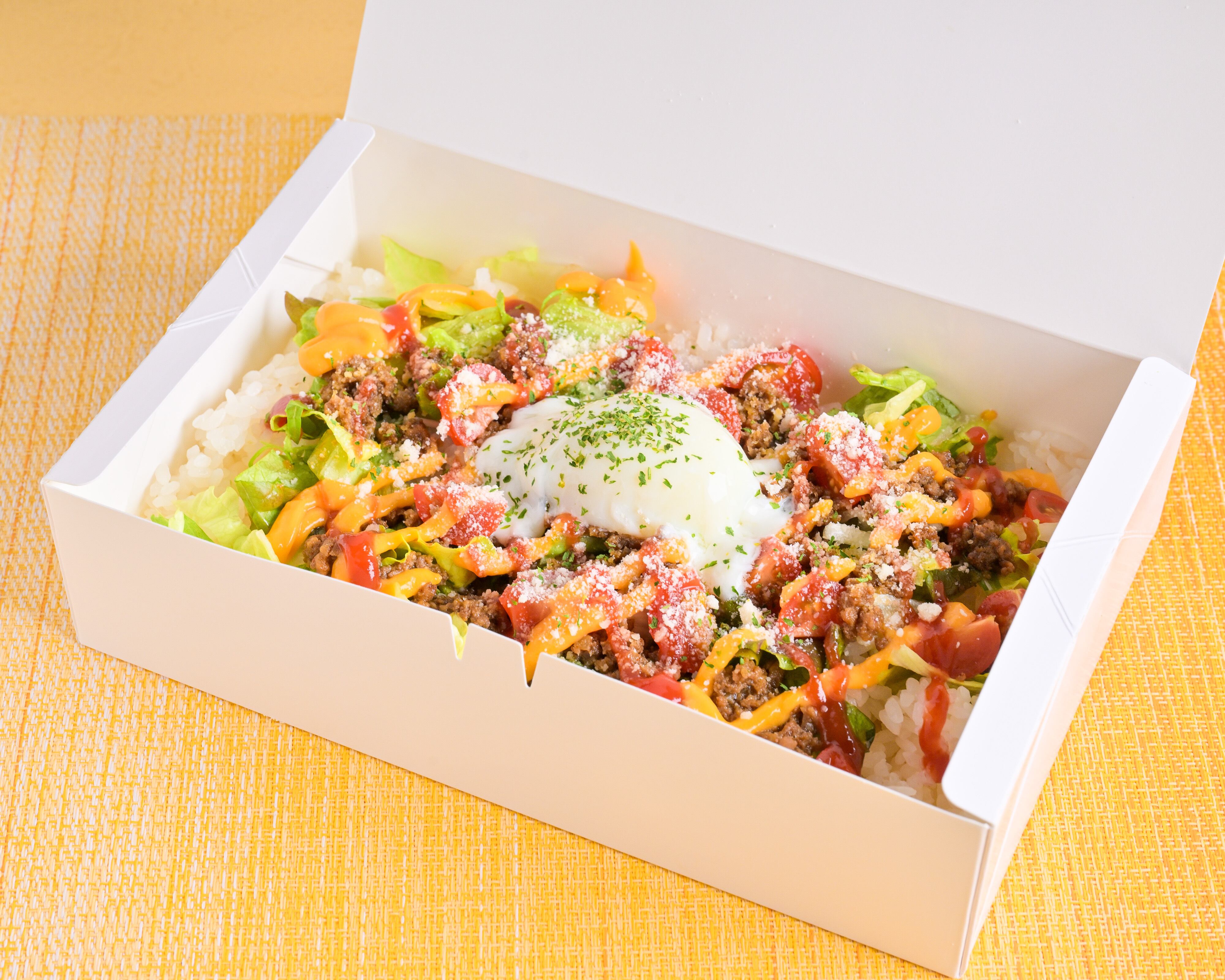 商品名:絶品タコライス -||- やみつきになる美味しさが特徴の絶品タコライスです。新鮮な野菜とスパイシーなタコスミートを組み合わせ、彼らが生み出すハーモニーが食欲をそそります。また、温泉卵がアクセントとなり、クリーミーな味わいをプラス。口にするたびに、驚きと満足感が広がる逸品です。